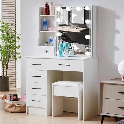 Teousev Sminkbord med belysning och spegel, justerbar ljusstyrka, toalettbord med pall, sminkbord med 6 lådor och 6 hyllor, 80 x 36 x 131 cm, vit, J356