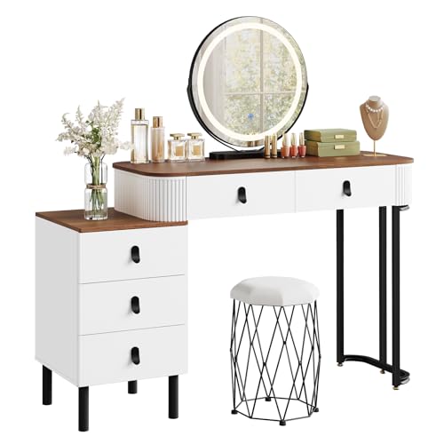 Litet Vitt/beige Sminkbord med Lådor, Toalettbord med Vadderad Stol, Sminkbyrå med Rund Spegel Justerbar LED-belysning, för Kvinnor Flicka Sovrum Familjens(White,60cm/23.6in)