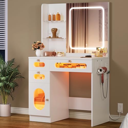 YITAHOME Sminkbord med justerbar LED-belysning och uttag, sminkbord med spegel, 4 lådor och pall, vit