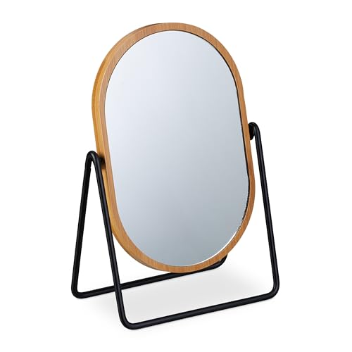 Relaxdays Sminkspegel, 360° roterbar, H x B 18 x 12 cm, bamburam, metallstativ, oval, sminkbord, natur/svart