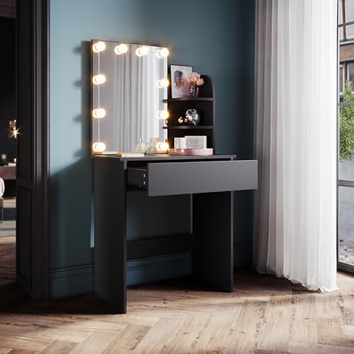 Aovquof Sminkbord med LED-belysning, 3 färger med justerbar ljusstyrka, toalettbord med spegel för make-up, sminkbord med spegel, svart M28