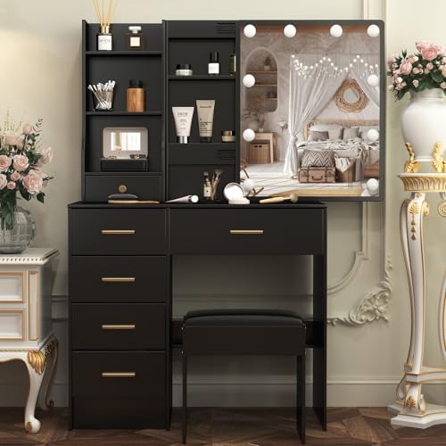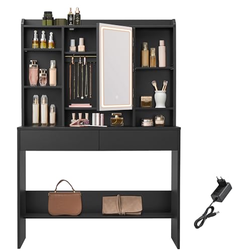 YITAHOME Sminkbord med spegel, sminkbord med 4 lådor, toalettbord med pall, belysning, uttag, svart (sminkbord, toalettbord, sminkbord, vanity Table)