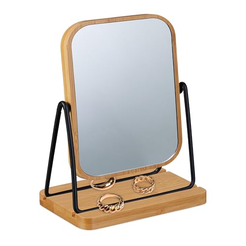 Relaxdays Sminkspegel, 360° roterbar, H x B 18 x 12 cm, bamburam, metallstativ, sminkbord, natur/svart