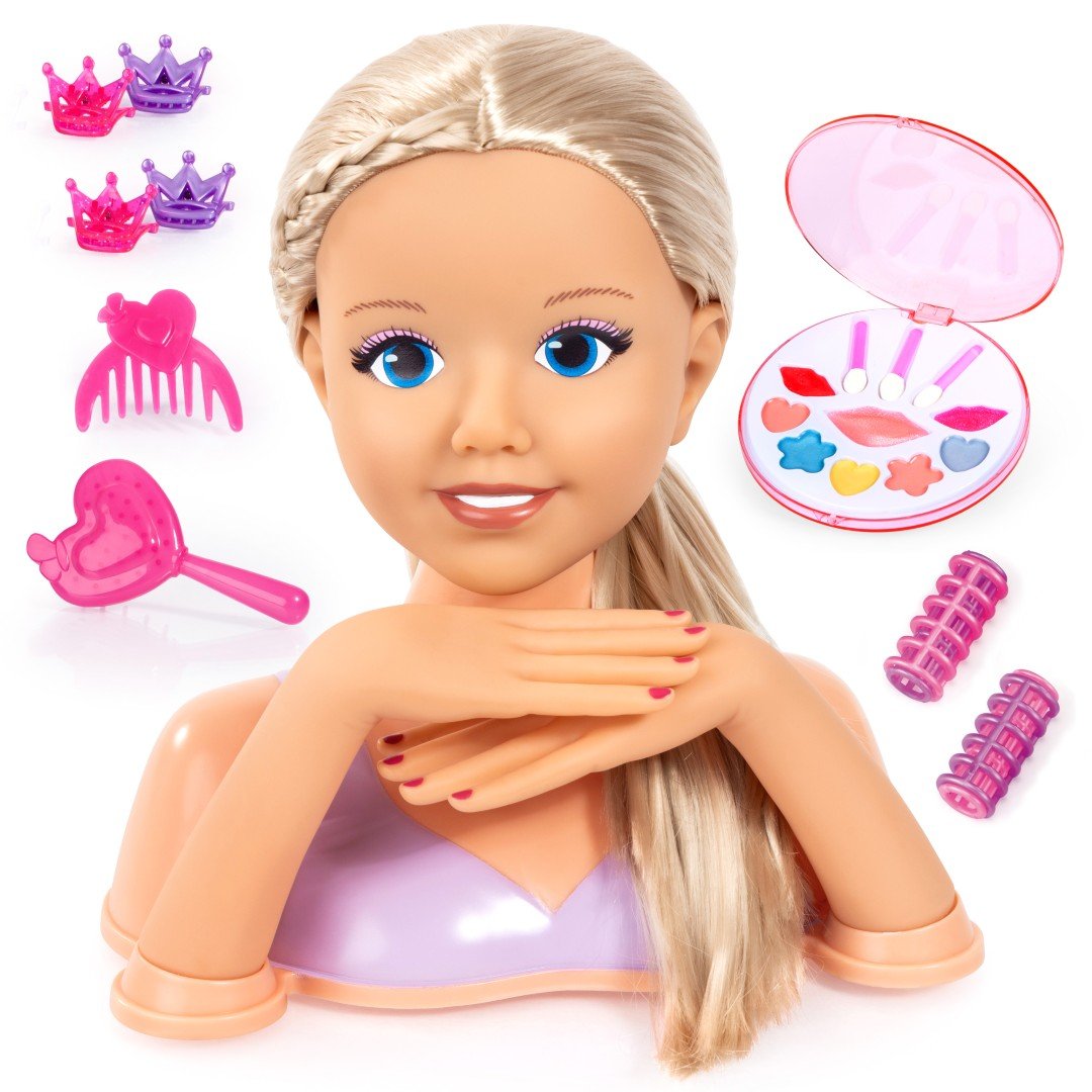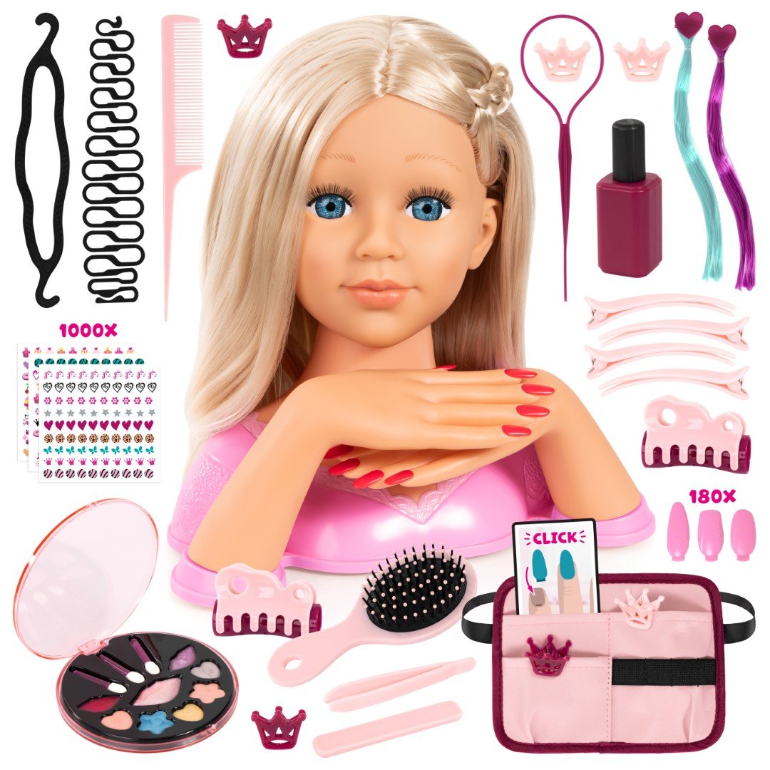 deAO Sminkdocka frisörhuvud för barn, 23 cm sminkhuvud docka långt blont hår med smink och hårstyling tillbehör, styling huvud sminkhuvud för flickor från 3 år