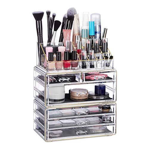 Relaxdays Sminkförvaring akryl, 2-delad sminkförvaring med läppstifthållare och 4 lådor, transparent/guld