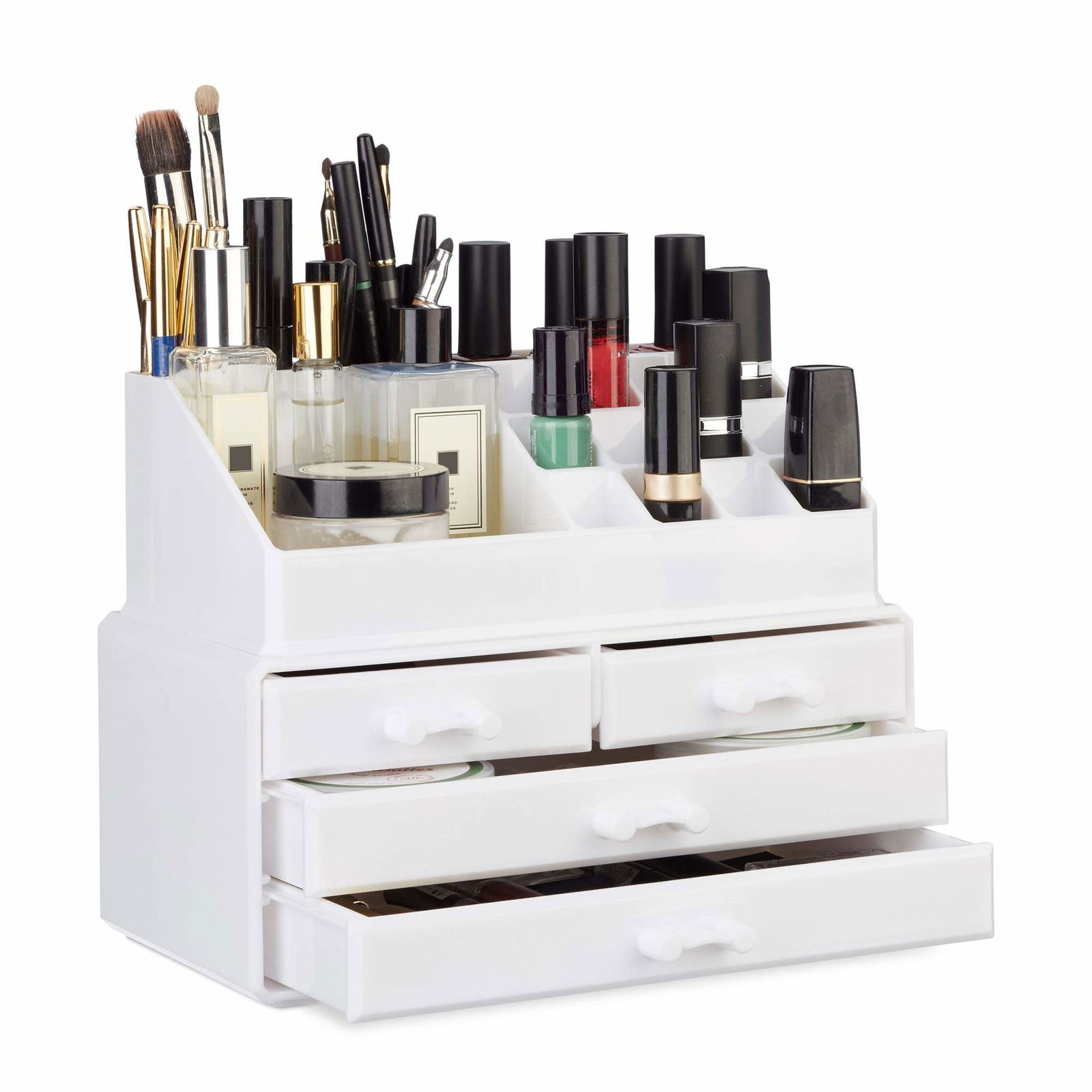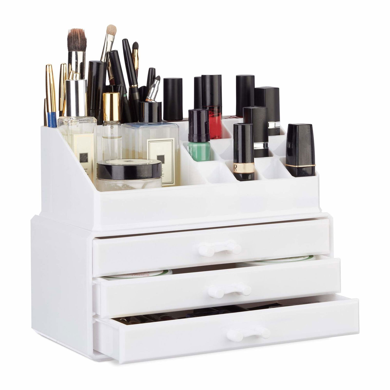 Relaxdays Sminkförvaring liten, 2-delad sminkförvaring med 3 lådor, stapelbar sminkhylla, vit, 14 x 23,5 x 19 cm