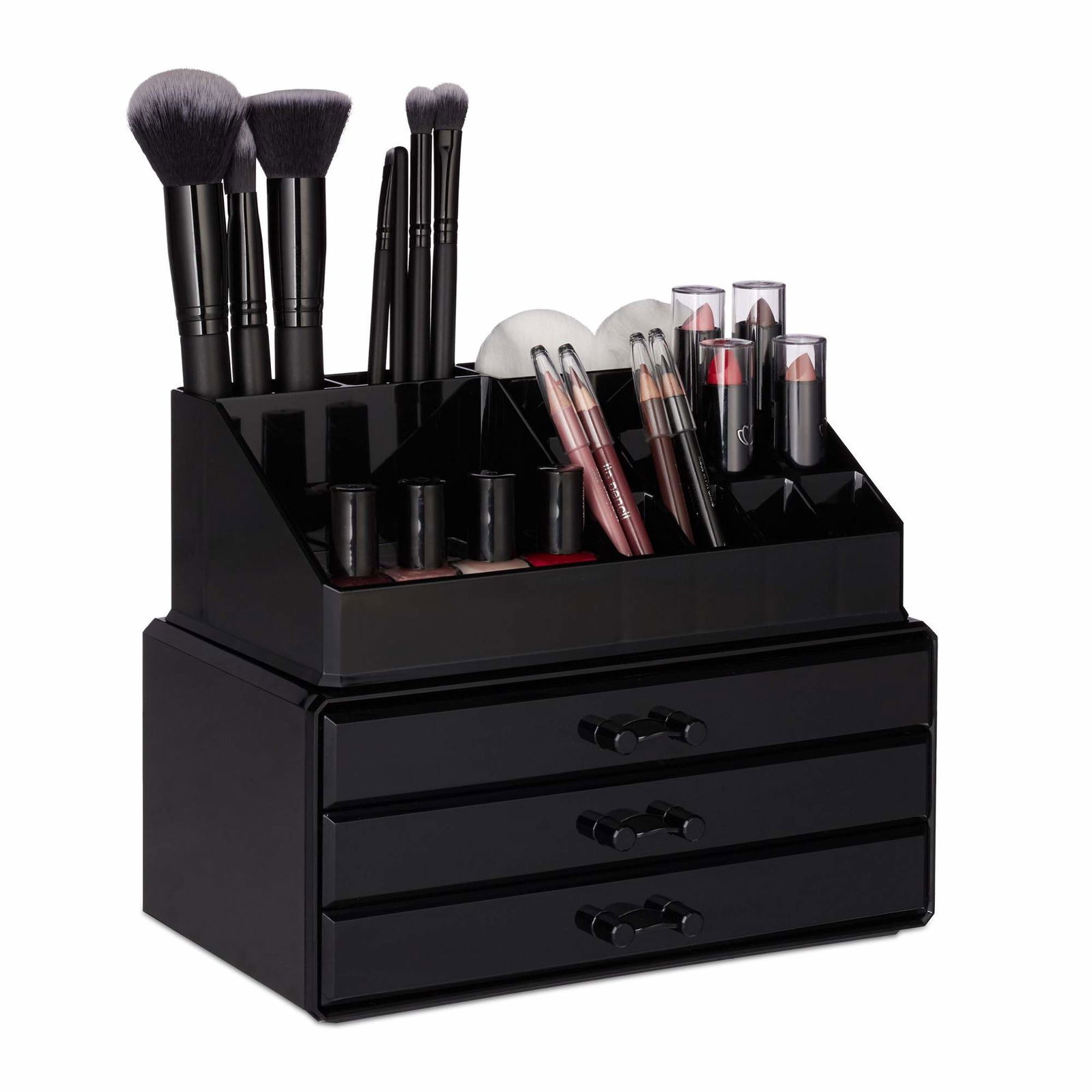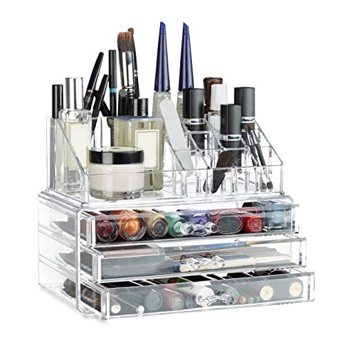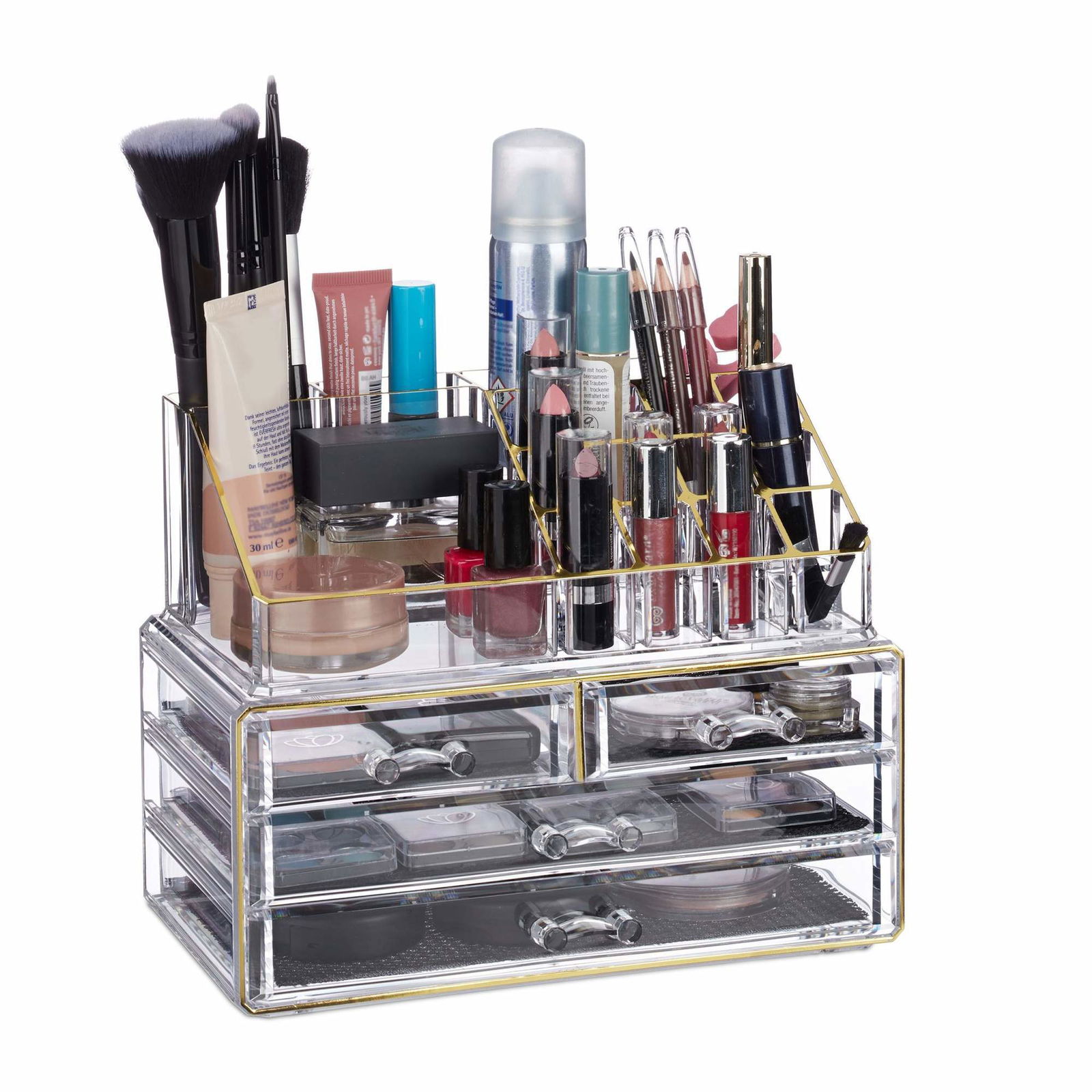 Relaxdays Sminkförvaring akryl, 2-delad sminkförvaring med läppstifthållare och 4 lådor, transparent, 19 x 24 x 13,5 cm