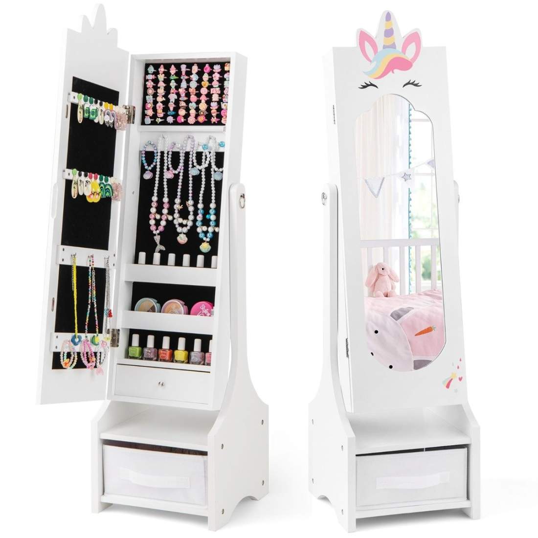 Fantas Smyckesskåp för barn, 2-i-1 spegelskåp lutbart med helkroppsspegel, låda och förvaringskorg, smyckesställ, sminkspegel med enhörning, 31,5 x 30 x 115 cm (rosa)