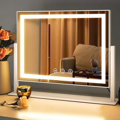 PRIMETEK Sminkspegel med ljus, 56 x 48 cm (22 x 18 tum), stor sminkspegel med LED-lampor, pekskärm med 3 färger, dimbar ljusstyrka för sminkbord kontor sovrum