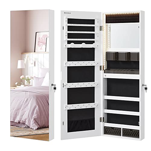 COSTWAY Smyckeskåp med helkroppsspegel, inbyggd sminkspegel och 3-färgade LED-lampor, smycken spegelskåp för ringar kedjekrokar örhängen, vägg-/dörrmontering (vit)