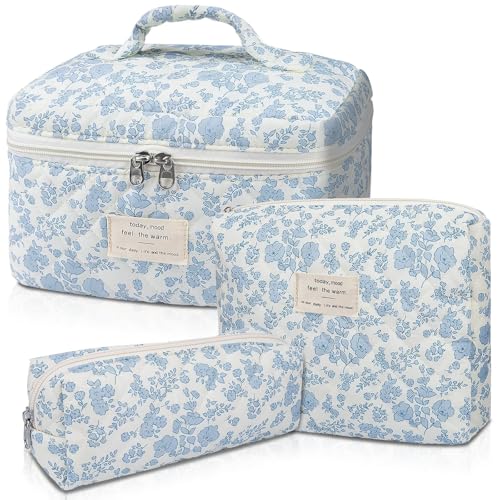 3-delars reseset med kosmetiska väskor för kvinnor, set med necessärer i bomull och quiltad necessär med blommönster, sminkväska, estetisk sminkväska för barn och kvinnor
