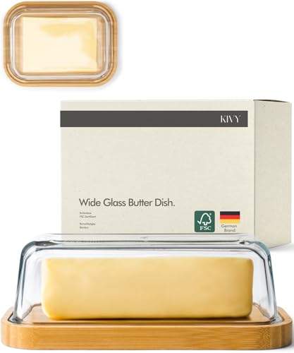KIVY Smörbytta – högkvalitativ smörbytta av glas med elegant och hållbart bambulock – smörkupa för 250 g smör – smörbytta i glas med lock i bambu – smörask trä – smörask – låda