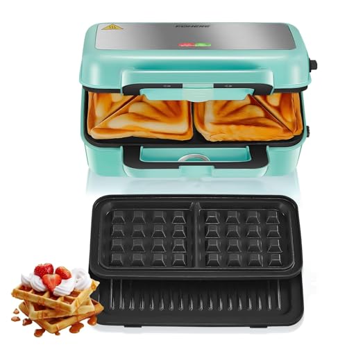 3-i-1-smörgåsjärn, 1200W våffeljärn/kontaktgrill/smörgåsbrödrost, 5 temperaturinställningar, non-stick-plattor, värmeisolerande handtag, diskmaskinssäker, LED-lampor, blå
