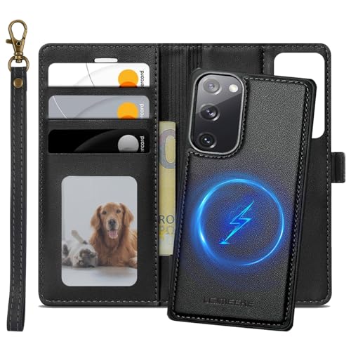 Tawarror Magnetiskt fodral för Samsung Galaxy S20 FE, kompatibelt med MagSafe, 2-i-1 avtagbart fodral premium PU-läder med vikfunktion och kortplatser, svart