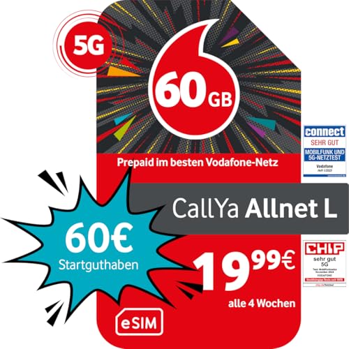 Vodafone Prepaid CallYa Allnet L | 60 GB | Åtgärd: 60 istället för 20 EUR Startkredit | utan kontrakt | 5G-nät | Telefon SMS-Flat | EU-roaming