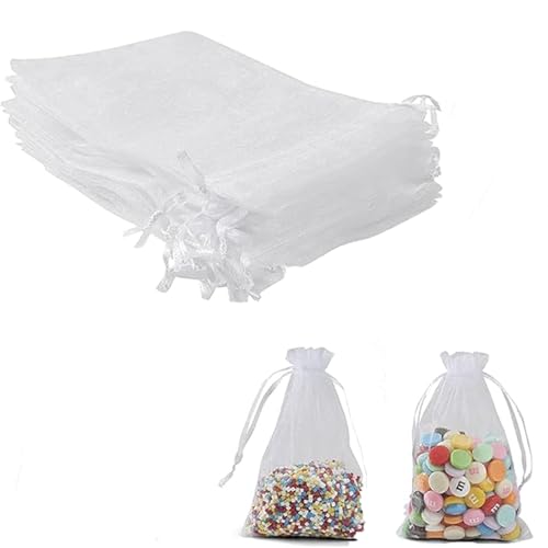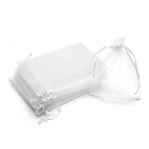 50 stycken vita organzapåsar, 7 x 9 cm, med dragsko, perfekta presentpåsar för bröllop, smycken, godis och små gåvor, mångsidiga organza-påsar för fester och speciella tillfällen