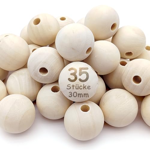 Kisvic Träkulor med hål 30 mm, 35 stycken stora, runda träpärlor, natur, träkulor, makramé för att trä på för gör-det-själv-smycken, tillverkning
