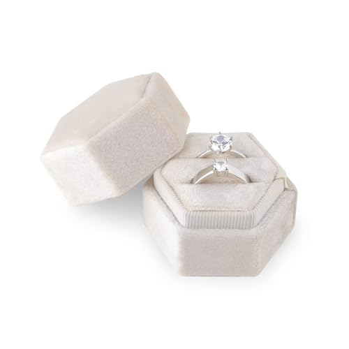 AIEX Sammetsringask för smycken, present, dubbla fack, sexkantiga ringfodral för förslag, förlovning, bröllopsceremoni, alla hjärtans dag, håller 2 ringar (beige)
