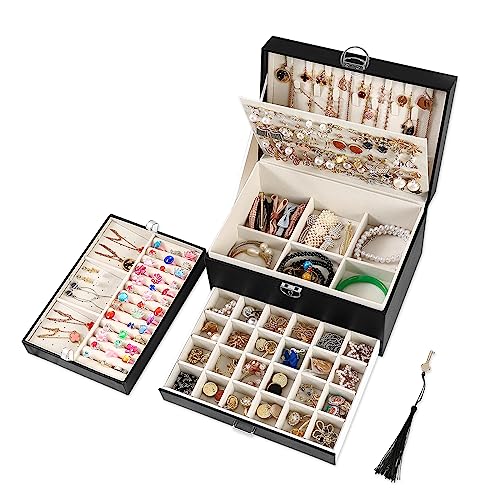 BOOVO Smyckeskrin 3 lager stor kapacitet låsning smycken organisatör flicka kvinnors halsband armband ring örhängen present smycken förvaringslådor (svart/beige)