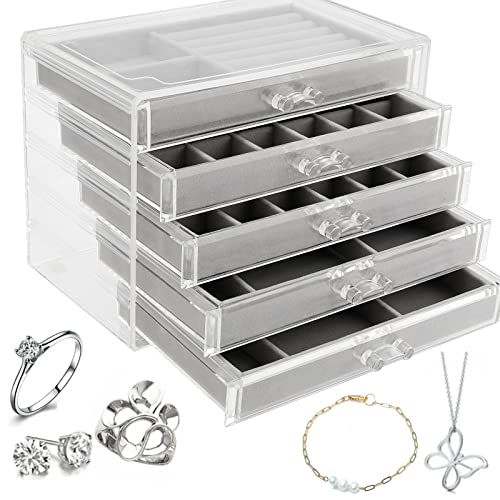 ZEONHEI 1 styck klart smyckeskrin i akryl, 5 lådor, transparent justerbar smyckesförvaring, organisatör för örhängen, ringar, halsband, armband, smyckesdisplay, 23,7 x 17,5 x 15 cm