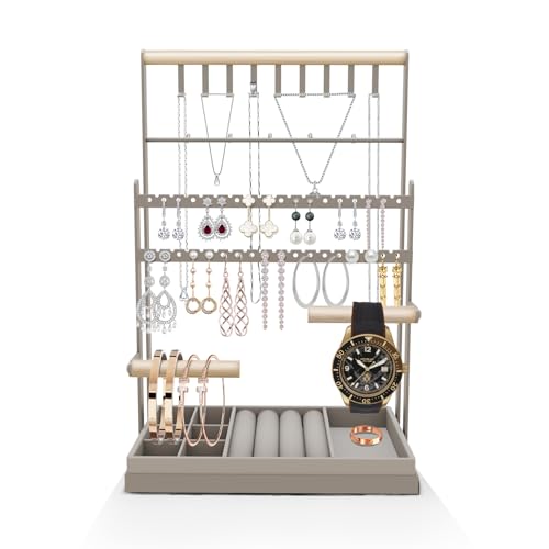 TFSZE Smyckesdisplayställ, 4 Tier Smycken Display Ställ, Sammetsfack, Smyckesdisplay med Ringbas, För Halsband Armband Örhängen Ringar(grå)