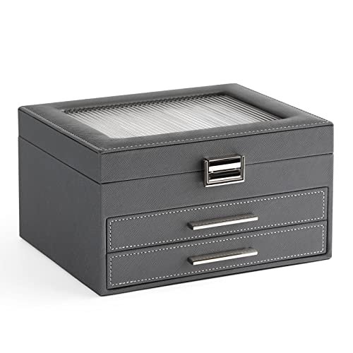 KAMIER Smyckeskrin, 2 lager PU-läder smyckeorganiseringslåda, stor kapacitet, dubbelt lås och stor spegel, dolda halsbandskrokar, avtagbara avdelare, presentförpackning förpackning, grå