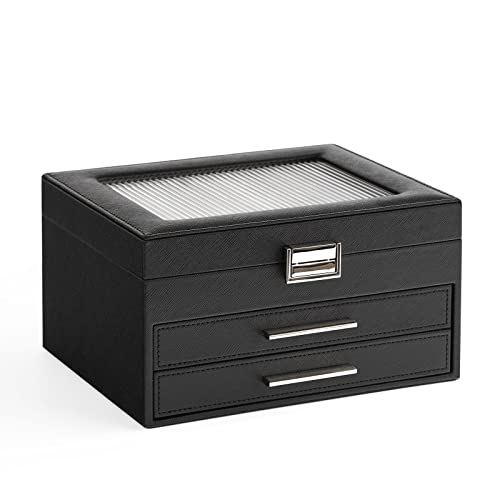 SYCARON Smyckeskrin stor organisatör för smycken i 2 lager PU-läder mjukt foder resesmyckefodral med lås för kvinnor och flickor ringar örhängen halsband armband klockor, svart