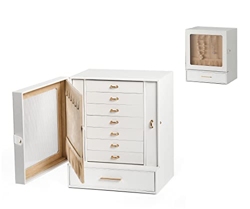 Meerveil Stort smyckeskrin, 10 lager extra smyckesorganisatör, Changhong-glas, PU-läder, smyckeförvaringsbox för halsband, örhängen, armbandsorganisatör, present till flickor och kvinnor, vit