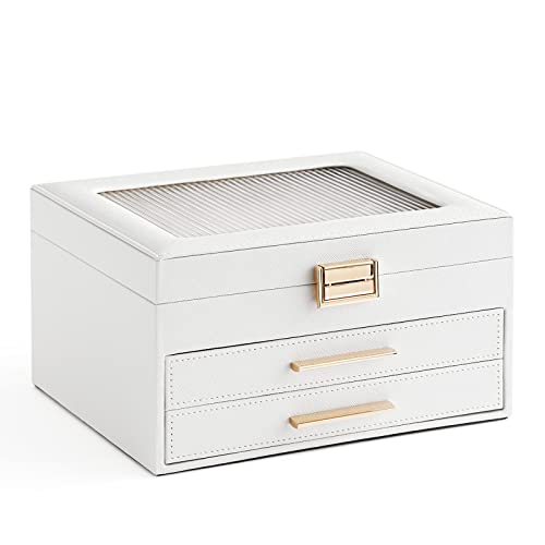 Meerveil Smyckeskrin, 3-nivås smyckeskrin, smyckesarrangör med 2 lådor, halvtransparent design, PU-läder, för halsband örhänge armband, vit