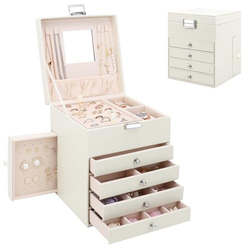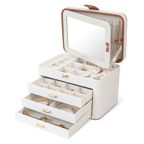 KAMIER Smyckeskrin för kvinnor, smyckesorganisatör i 4 lager med spegel, 3 lådor, smyckeskrin julklapp, för örhängen, halsband, armband, ringar, vit