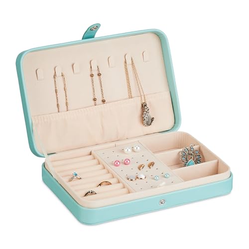 Relaxdays Smyckeskrin, förvaring, ringar, örhängen och kedjor, resesmyckesfodral, HBT: 4,5 x 21 x 14,5 cm, turkos