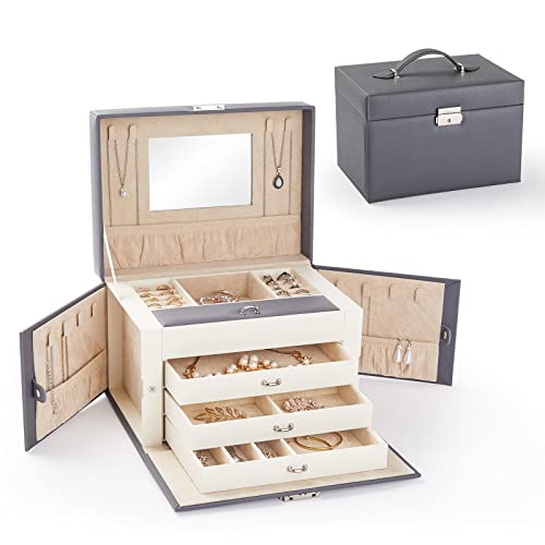 Meerveil Smyckeskrin, stort smyckeskrin med låsspegel och 3 avtagbara lådor, 4 nivåer kvinnor flickor smycken organiserare för örhängen ringar halsband armband, 26 x 17,5 x 18,8 cm, grå