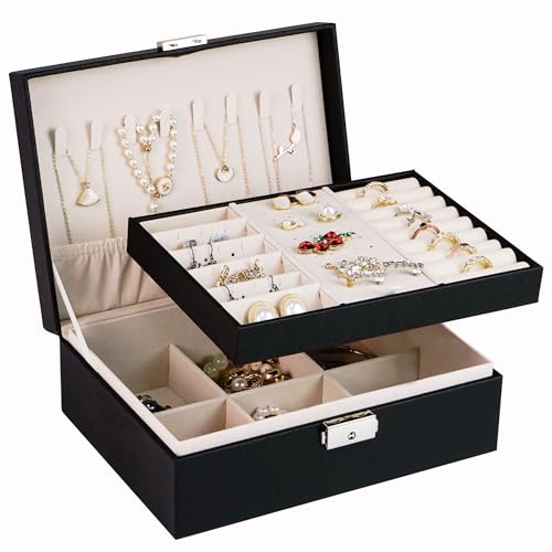 ProCase Smyckeskrin, 2 nivåer stora smyckeskrin, förvaringsfodral för örhängen, armband, ringar, halsband – svart