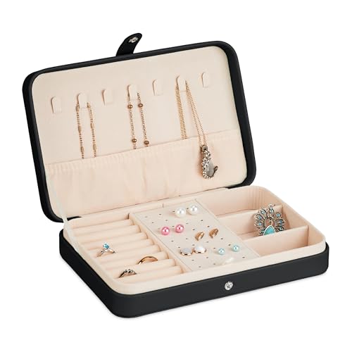 Relaxdays Smyckeskrin, förvaring, ringar, örhängen och kedjor, resesmyckesfodral, HBT 4,5 x 21 x 14,5 cm, svart