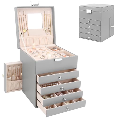Casiwaft Smyckeskrin med 6 lådor, stor PU smyckeskrin 5 nivåer med sidolådor och speglar, smyckeskrin för ringar, örhängen, armband, halsband, grå