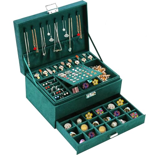 QBestry smyckeskrin för kvinnor, grön sammet smyckeskrin 3 lager stort smyckeförvaringsfodral med låsringar smyckeskrin organiserare för örhängen halsband armband förvaringsbox, grön