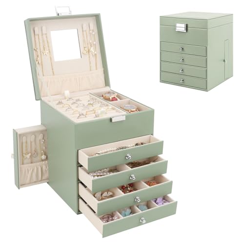 Smyckeskrin med 6 lådor och spegel, stor PU smyckesarrangör visningsfodral med sidolådor, 5 lager smyckeskrin för ringar, örhängen, armband, halsband, avokadogrön