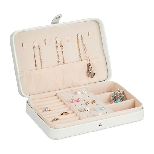 Relaxdays Smyckeskrin, förvaring, ringar, örhängen och kedjor, resesmyckesfodral, HBT: 4,5 x 21 x 14,5 cm, vit