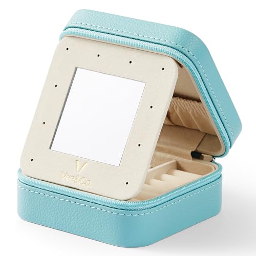 VEE&CO. Damdagspresenter 2024 litet resesmyckesfodral, mini smyckesorganisatör med spegel bärbar display förvaring smyckeskrin för örhängen, ringar, halsband, armband för kvinnor flickor (blå)