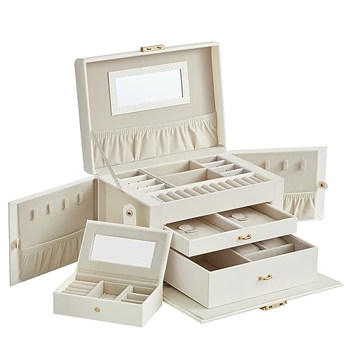 Songmics Smyckeskrin 3 nivåer, smyckeskrin 2 lådor, bärbar minilåda för resor, med handtag, låsbar, presentidé, PU-överdrag i klassiskt vitt, foder i krämvitt JBC121W02