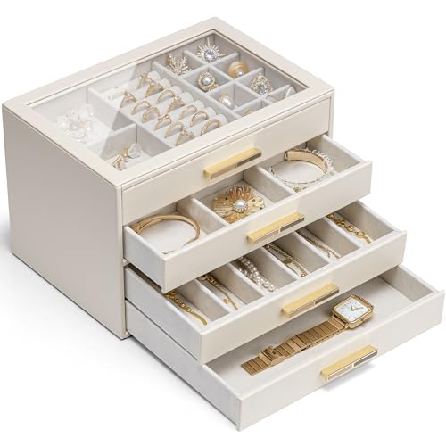 VLANDO Stor smyckeskrin med 4 hyllor och 4 lådor - Modern smyckeskrin i vitt med härdat glaslock - för halsband, örhängen, armband, klockor (vit)