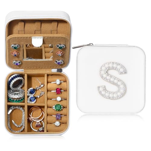 Parima Smyckeskrin för resor – litet smyckeskrin för kvinnor | resesmyckesförvaring med initial S | smyckeslåda smyckeslåda för ringar, armband, örhängen, halsband | presenter till kvinnor