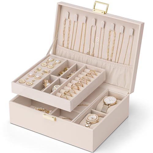 Vlando Smyckeskrin för kvinnor flickor, 2 nivåer smyckesförvaring PU-läder, smyckeslåda, smyckesorganisatör damer, smyckeskrin, klockförvaring, för ringar örhängen halsband, beigerros