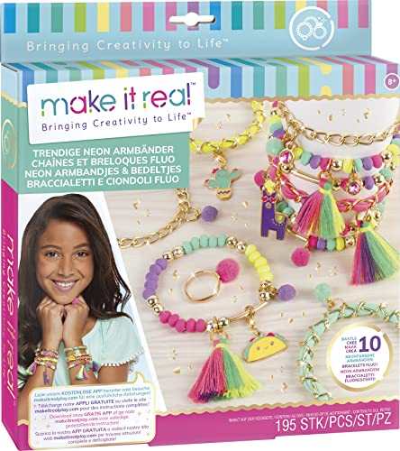 Lansay - MAKE IT REAL - Fluo kedjearmband och berlocker kit - smyckestillverkning för barn från 8 år - set för 10 färgglada armband med pompoms och berlocker - tillbehör ingår