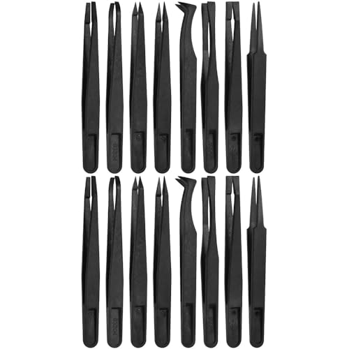MMOBIEL 16 delar, antistatisk plast, precisionspincettset, pincett med spetsig platt spets/böjd spetspincett för elektronik, smycketillverkning, laboratoriearbete, svart