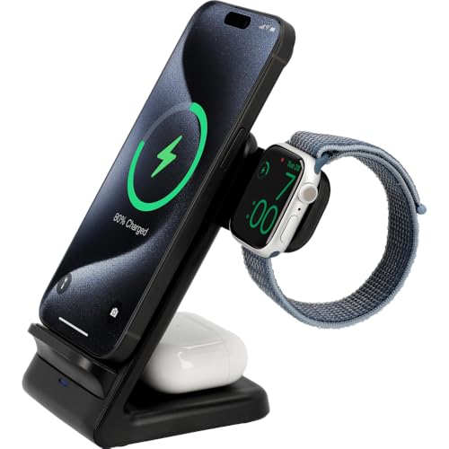Just IN Case I Snabb trådlös laddare stativ 15 W (3-i-1 stativ, Qi-certifiering, stöd laddningsstation, USB-C, för smartphone, smartwatch och hörlurar) svart