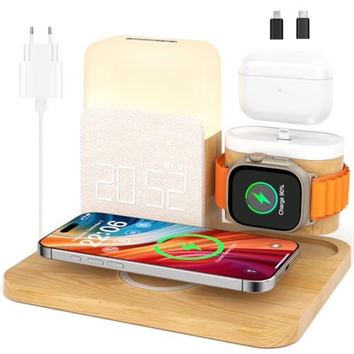 COLSUR 5-i-1 laddningsstation för Apple Watch iPhone Airpods,15 W snabb trådlös laddare för iPhone 17/16/15/14/13, sänglampa med laddningsfunktion, väckarklocka med laddningsstation
