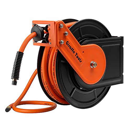Giraffe Tools Giraffverktyg infällbar luftledningsrulle 15 m + 1 m, väggmonterad luftslangsrulle 3/8 tum hybridslang, pneumatisk kraftig stålrulle med 1/4 tum snabbkoppling