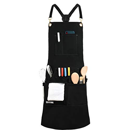 QeeLink kockförkläde i professionell kvalitet för kök, grill och grill med 10 verktygsfickor – vattentåligt canvasförkläde med snabbspänne, justerbart M till XXXL för män och kvinnor, svart, svart,