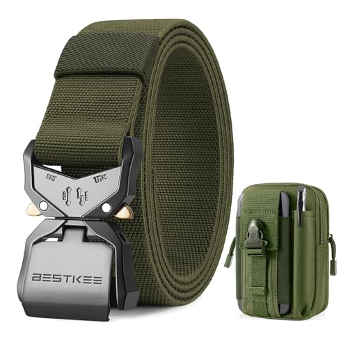 BESTKEE praktiskt bälte för män, arbetsbälte tunglast-bälte, militärstil snabbspänne, metallspänne 38 mm bred, present med taktisk väska och krok
